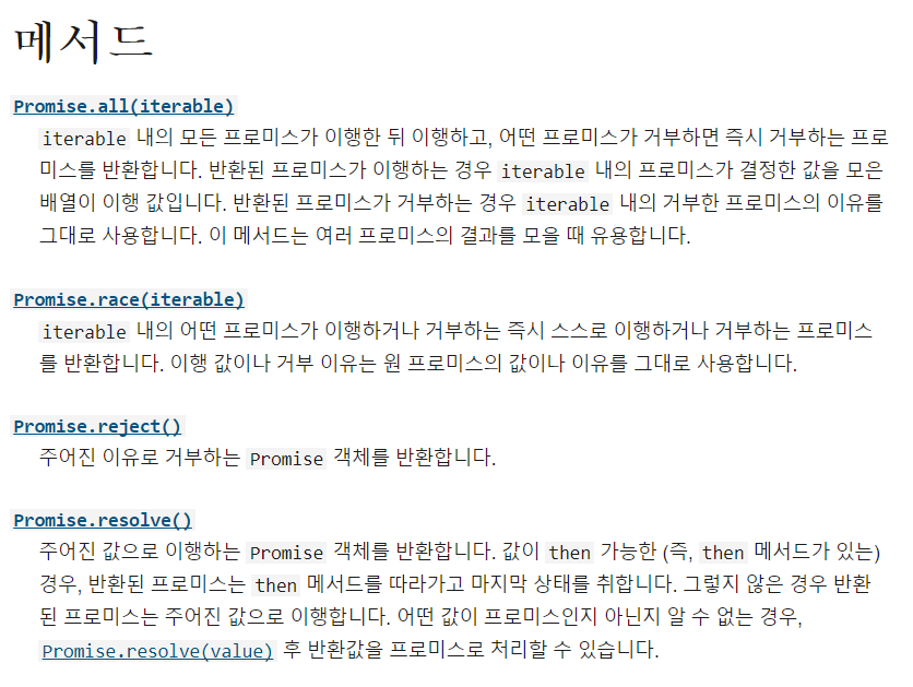 Promise의 메서드에 대한 더 자세한 설명은 여기에서 확인 가능하다.