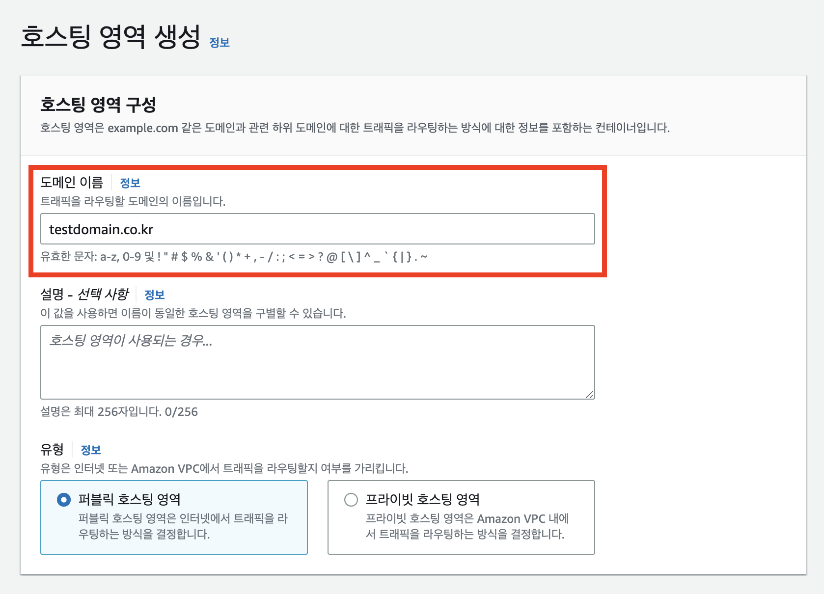 3-2. 구매한 개인 도메인 이름을 입력해 준 뒤, [호스팅 영역 생성] 버튼을 눌러준다.