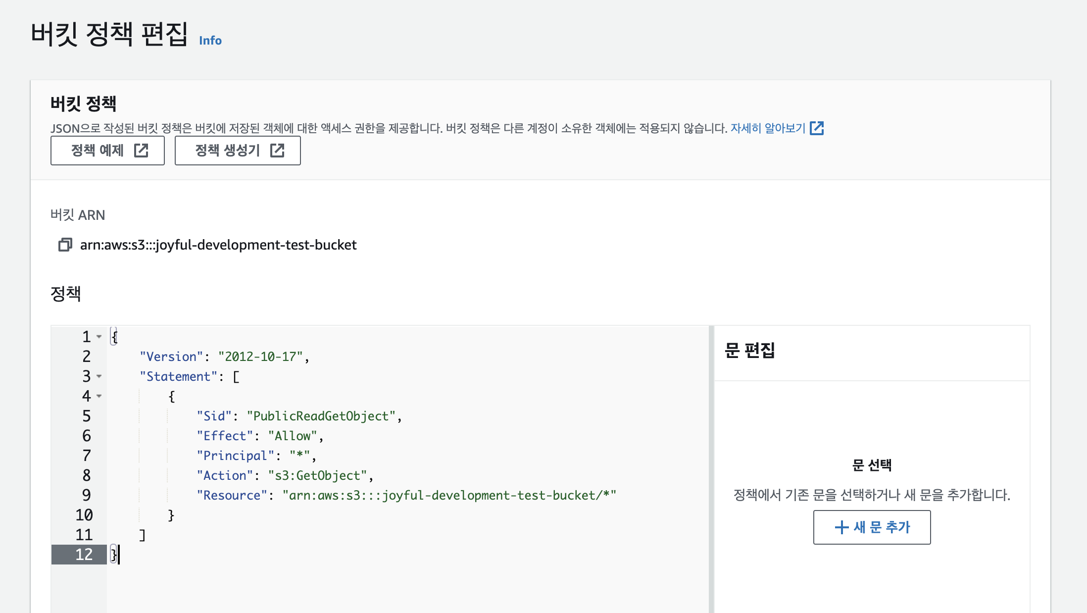 오류해결-3. 버킷 정책에 json 형태의 정책을 복붙 해준 뒤(Resource의 값은 정책을 편집하고자 하는 S3버킷의 ARN으로 넣어준다.), [변경 사항 저장] 버튼을 클릭해 정책을 저장한다.