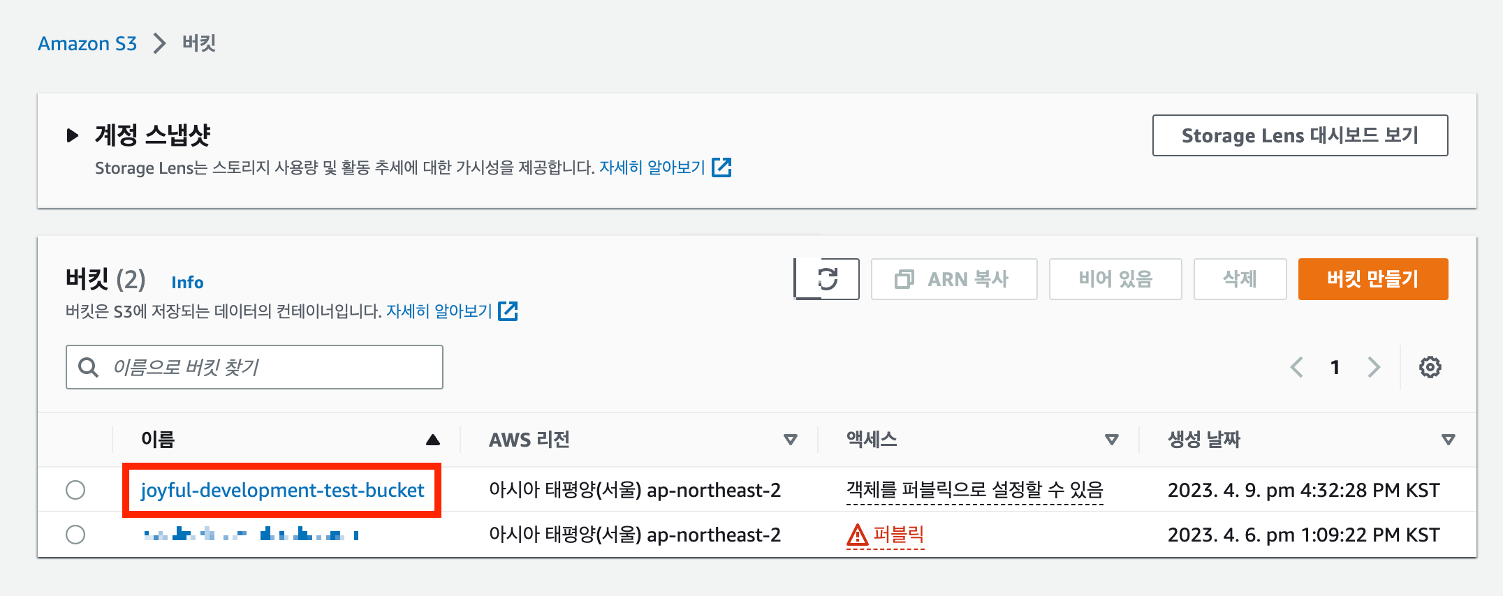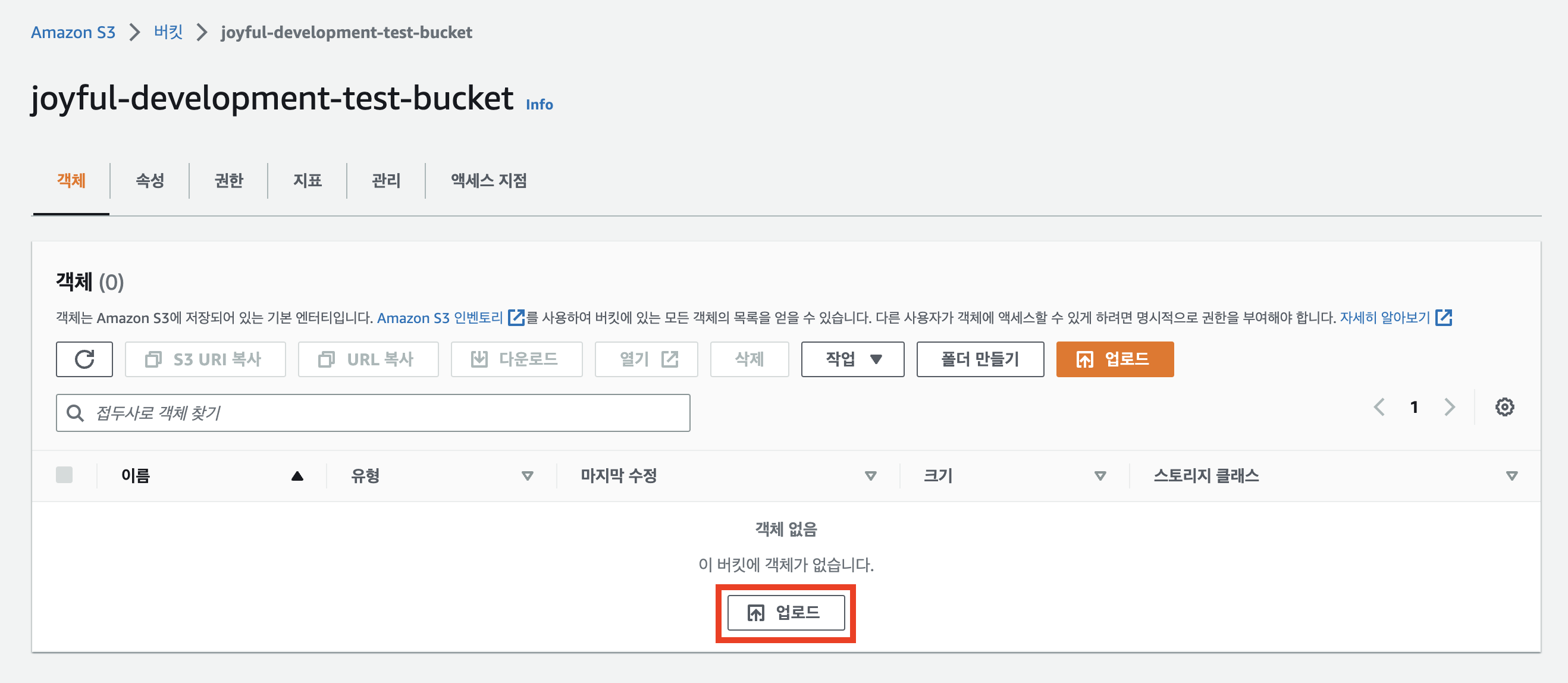 1-5. 방금 생성한 버킷의 이름을 클릭해 상세 페이지에 진입한다.