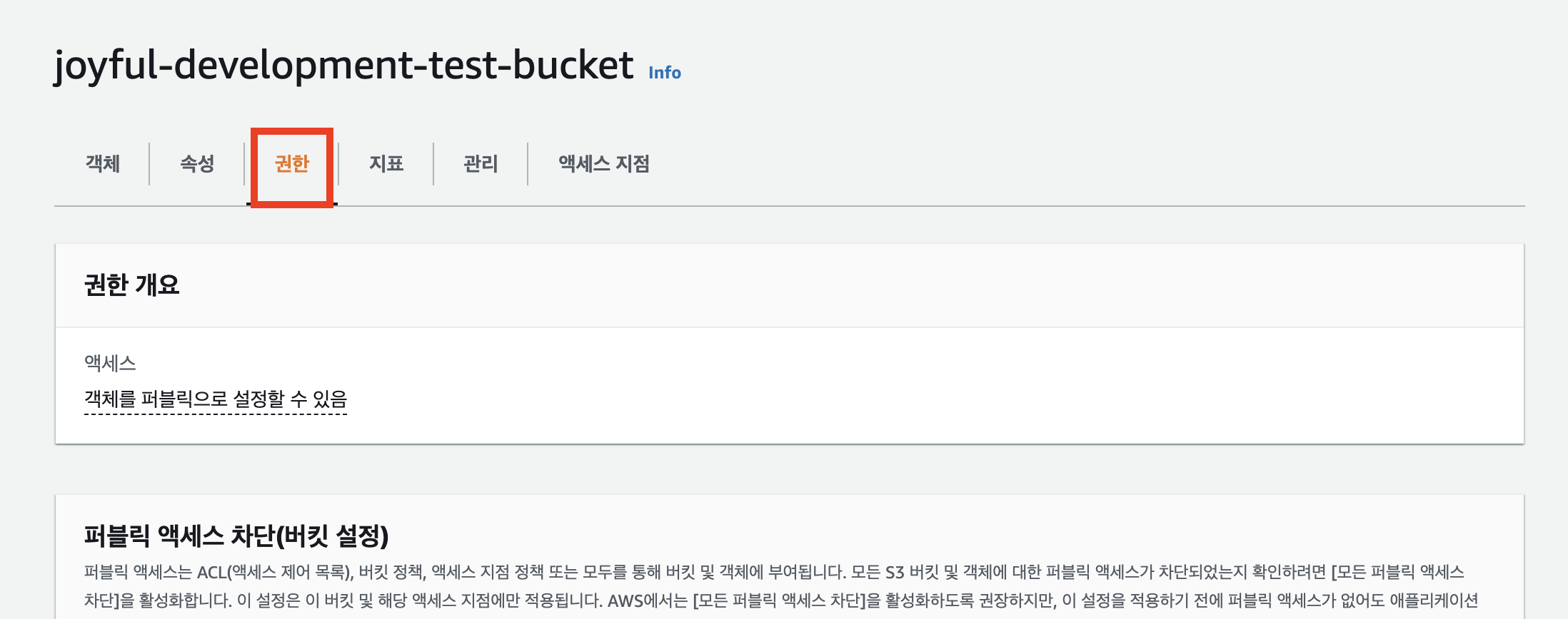 빌드 파일을 업로드해 두었던 S3 버킷 상세페이지로 다시 접속한 뒤, 상단의 [권한] 탭으로 이동해 준다.