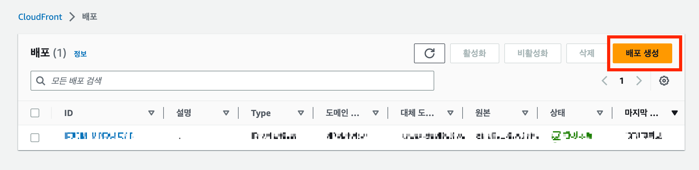 2-1. S3에 업로드한 파일을 CDN을 통해 배포하기 위해 AWS 콘솔에서 CloudFront 페이지로 이동해 [배포 생성] 버튼을 클릭해 준다.