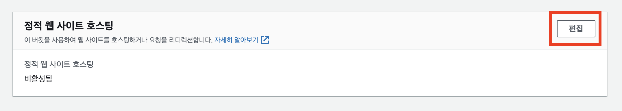 1-6. 버킷 상세페이지 상단의 [속성] 탭을 클릭해 속성 탭으로 이동 한 뒤, 아래쪽에 있는 정적 웹 사이트 호스팅 옆 [편집] 버튼을 클릭한다.