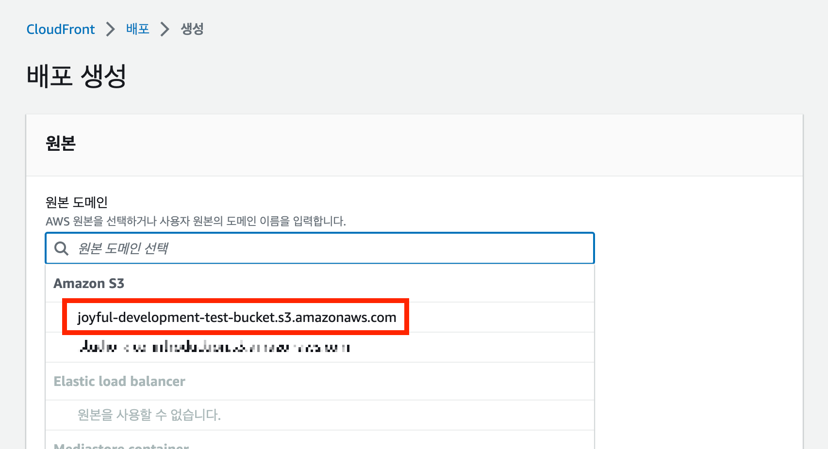 2-2. 원본 도메인을 클릭해 아까 생성해 둔 S3 버킷을 선택한다.