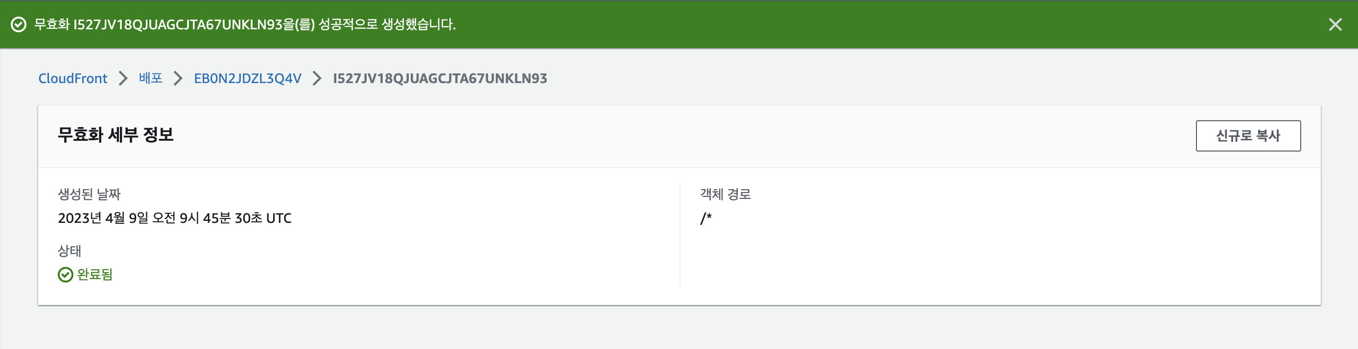 무효화를 생성한 뒤 상태가 '완료됨'으로 변경되면 기존 캐시가 무효화되어 배포한 사이트에 새로운 파일이 업데이트된다!