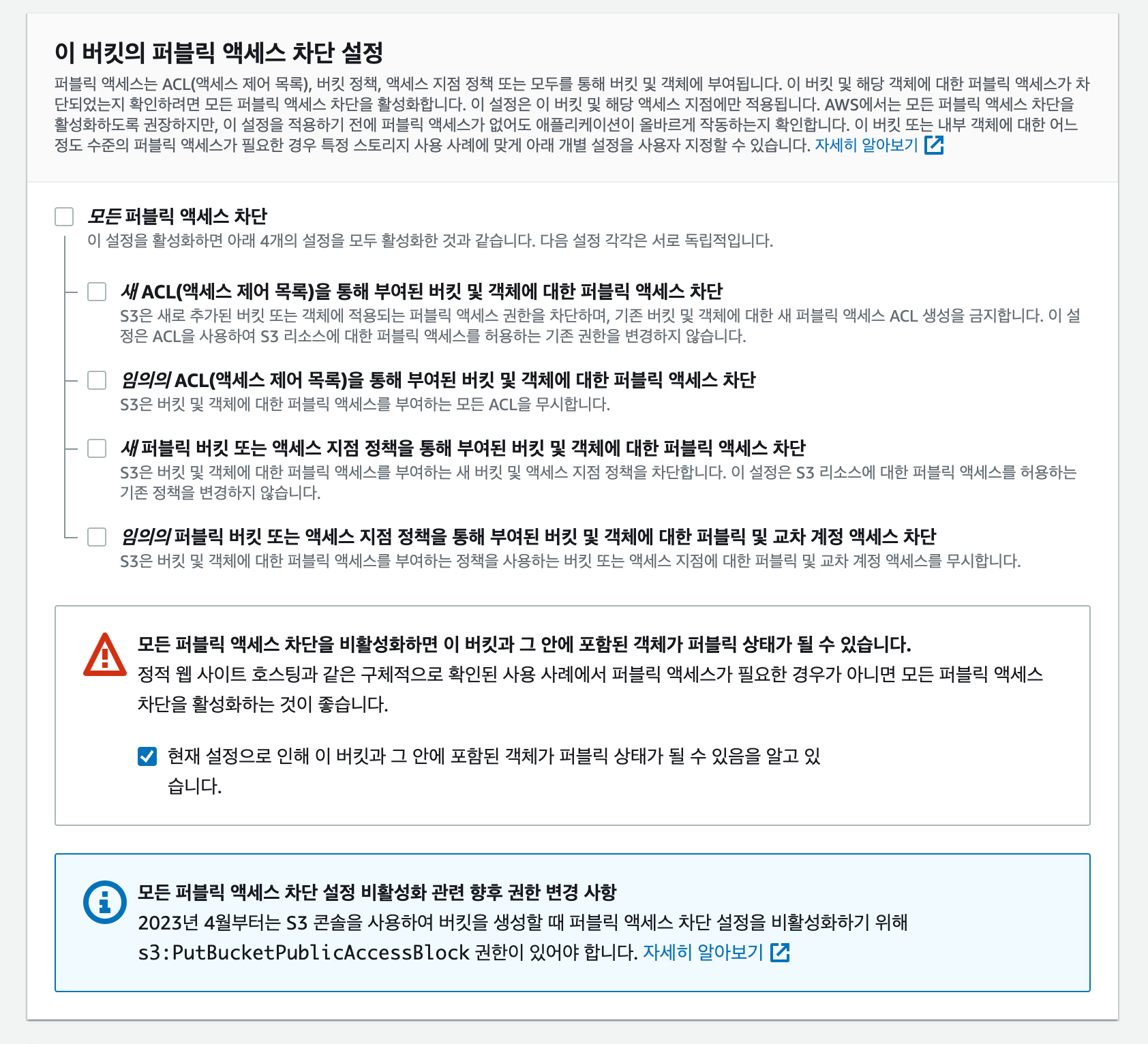 1-3. 버킷의 퍼블릭 액세스 차단 설정에서 모든 퍼블릭 액세스 차단 체크 박스를 해제해 준다. 우리는 정적 웹 사이트 호스팅을 할 예정이기 때문에 퍼블릭 액세스가 필요하다.