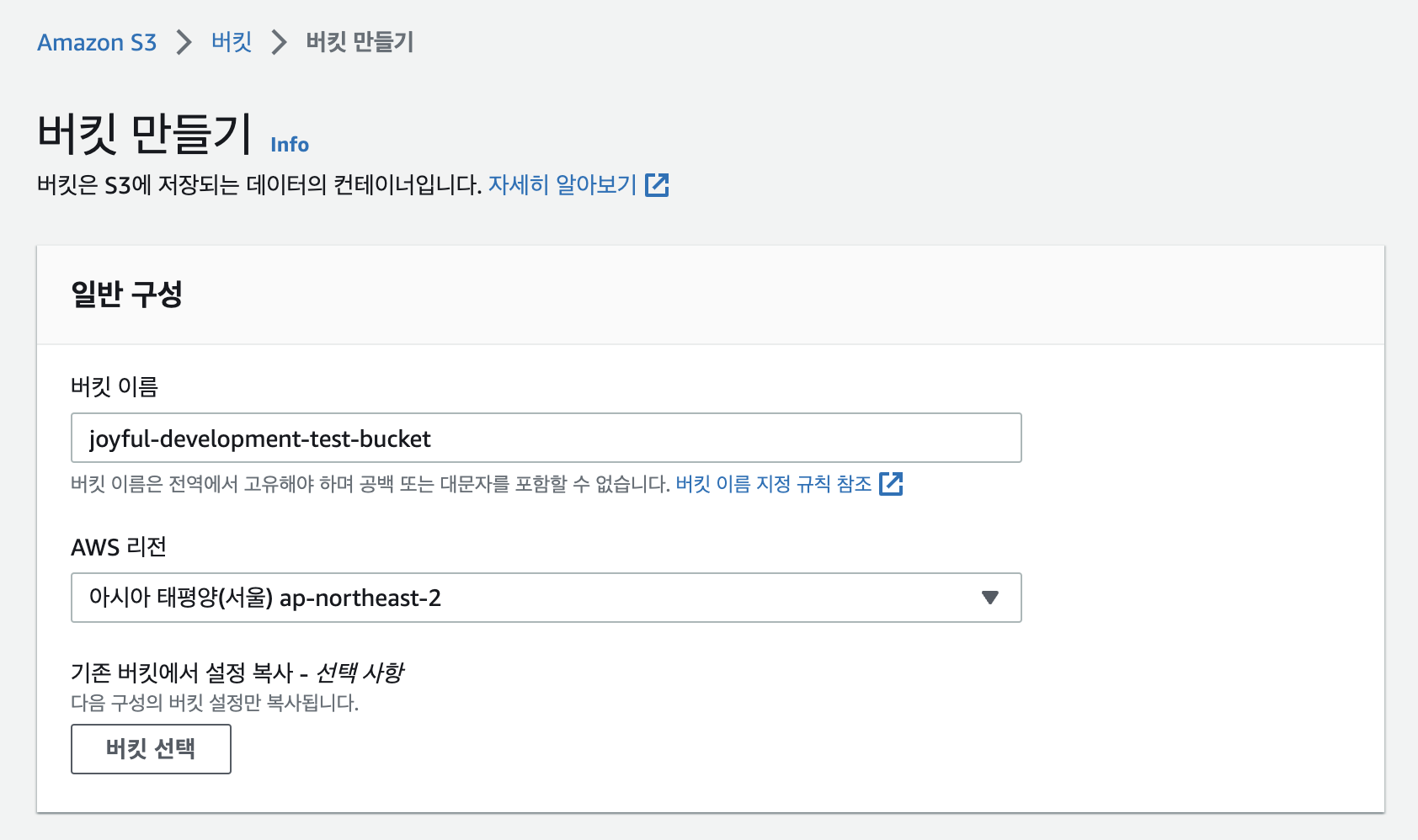 1-2. 버킷 이름과 AWS 리전을 설정해 준다. AWS 리전은 가까운 곳으로 설정해 주는 것이 좋다.