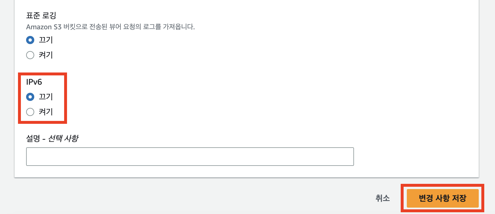 2-6. 나중에 cloudFront와 연결할 대체 도메인 이름(CNAME)을 추가해준다. 그리고 기본값 루트 객체에 html 파일명을 적어주고, IPv6 설정을 꺼두고 나머지 설정은 기본값을 사용하여 변경 사항을 저장한다.