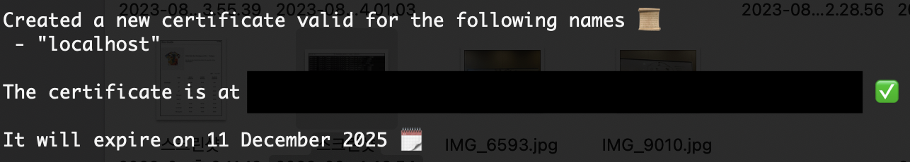 2. 아래 명령어를 입력하면 로컬 인증 기관(CA)이 생성되고, mkcert로 생성한 로컬 CA는 기기에서 로컬로만 신뢰할 수 있다.