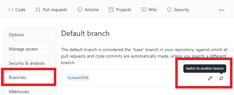 저장소의 setting으로 가서 default branch를 본인의 branch로 변경해주면 잔디가 적용되는 걸 확인할 수 있다!